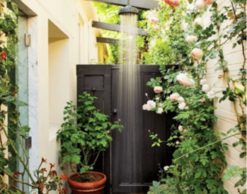 This rosey delight will be sure to turn heads. We’re in love with the black beams, potted plants and climbing roses that frame the shower. Not only do the roses give off a pretty aesthetic, they also offer a natural fragrant. This design is truly beautiful, and could work as an outdoor rinse off area if you have a pool or spa.